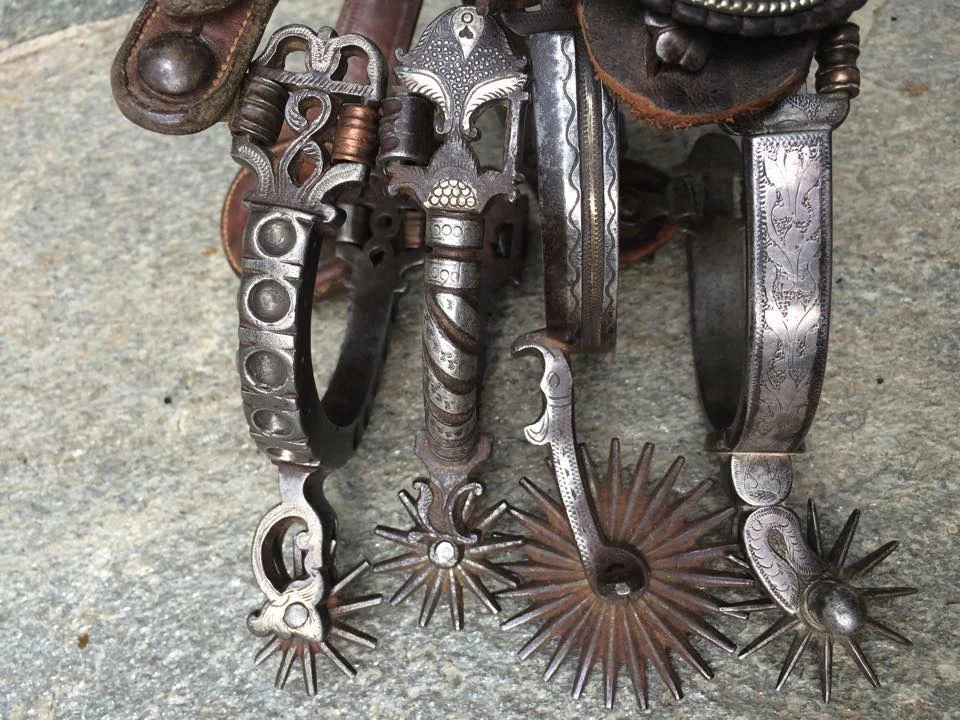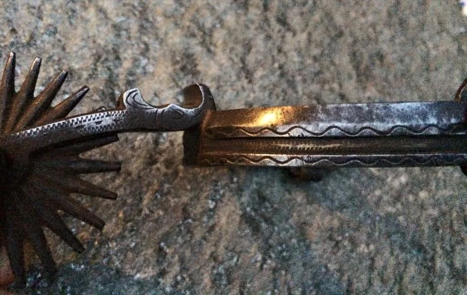Exceptional pair of Spanish Colonial/Early California style chiseled iron spurs by Joseph de la Ronde of Glorieta, New Mexico